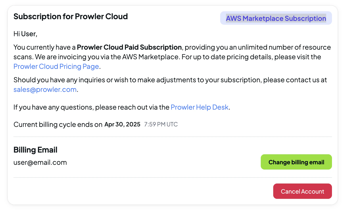 You will be charged monthly based on resources scanned and monitored depending on usage in Prowler Cloud. For more information on billing, please see the Prowler Cloud Pricing FAQ. Note: Your Prowler Cloud bills can be seen at AWS Billing.Subscription